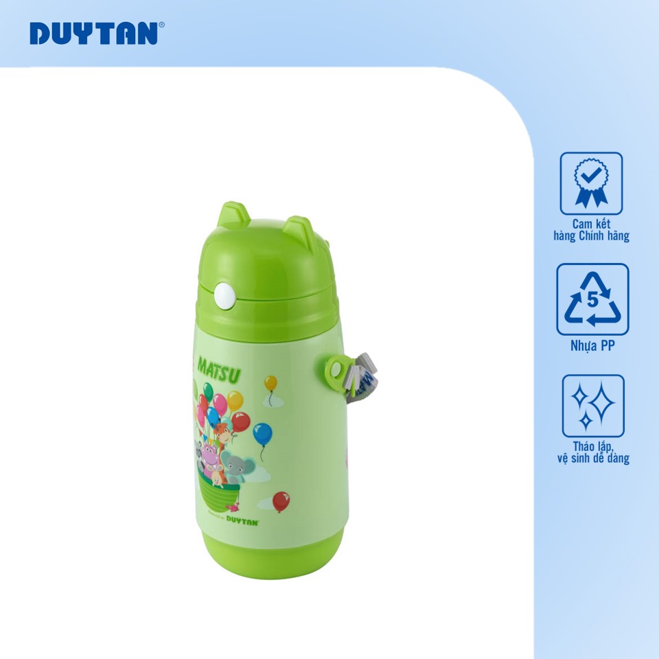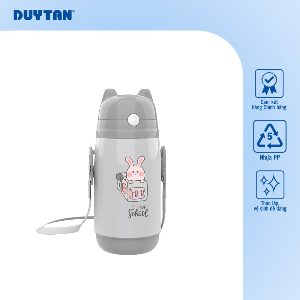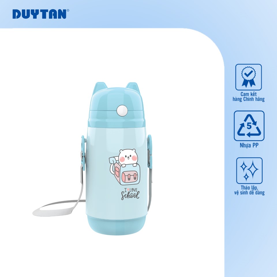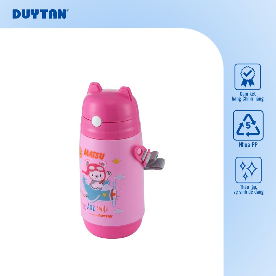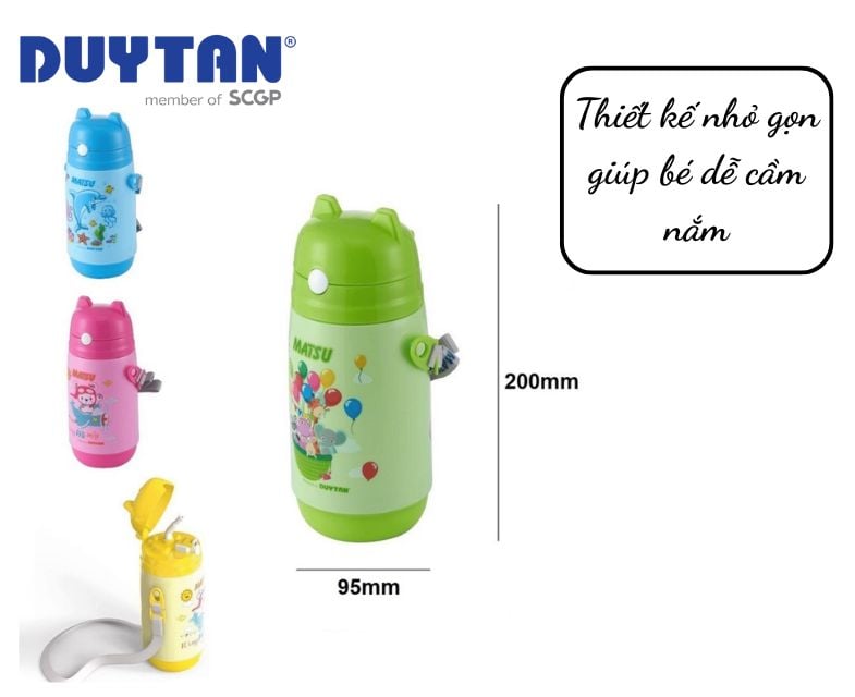 Bình nước Duy Tân có kiểu dáng nhỏ gọn, dễ cầm nắm cùng các họa tiết, màu sắc sinh động, ngộ nghĩnh, rất phù hợp với trẻ em. Thiết kế này không chỉ khiến bé thích thú khi sử dụng mà còn giúp bé hình thành thói quen uống nước đều đặn mỗi ngày.