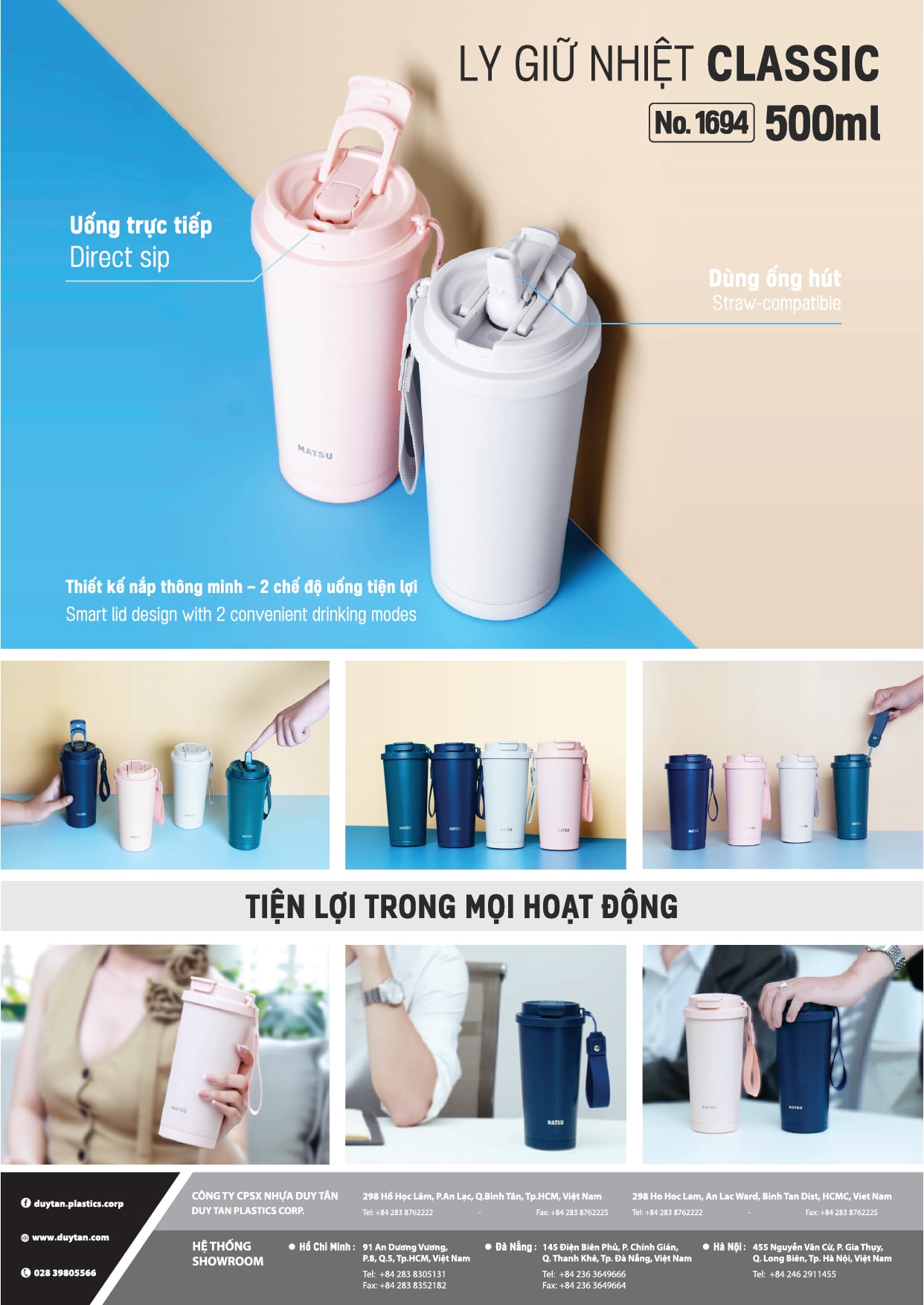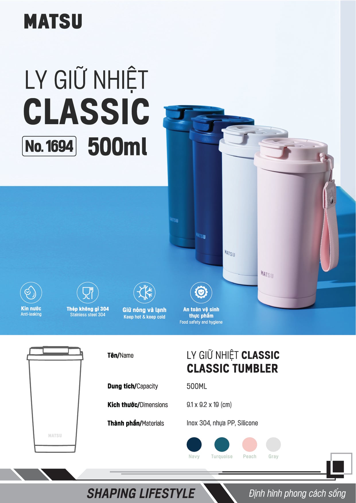 Ly Giữ Nhiệt Classic 500ml MATSU - Nắp 2 Chế Độ, Giữ Nhiệt Lâu, Thép Không Gỉ 304